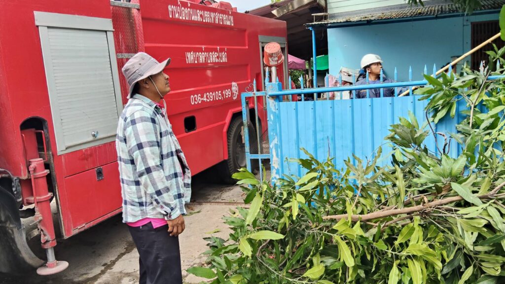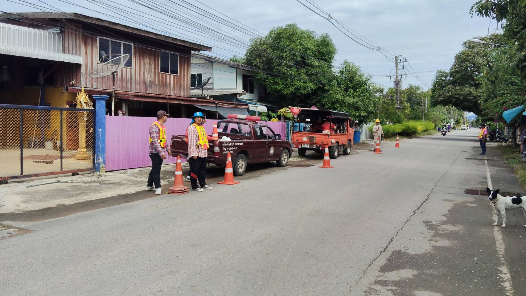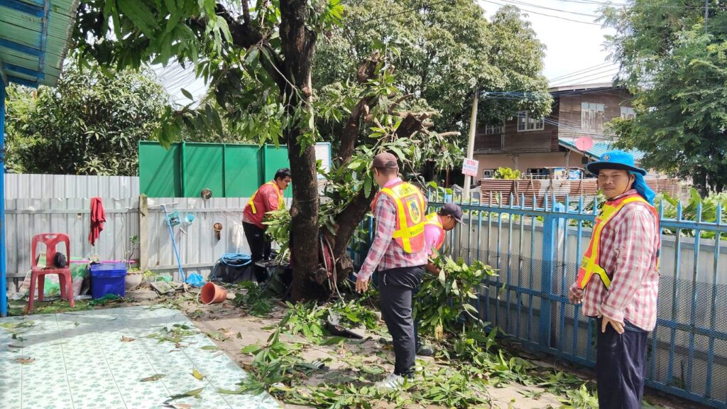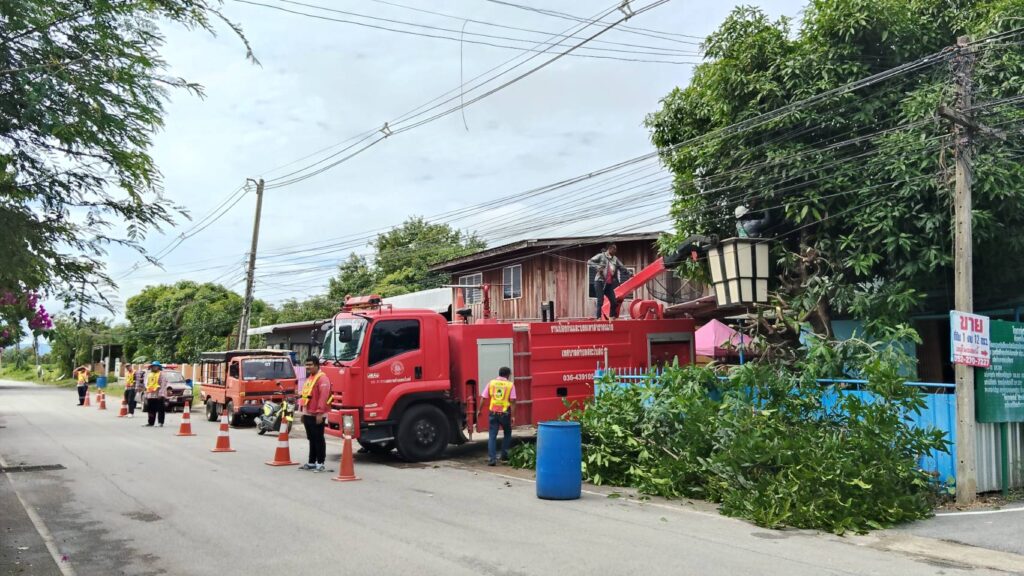 ประสานเจ้าหน้าที่การไฟฟ้าอำเภอสระโบสถ์ ตัดแต่งกิ่งไม้ที่ติดกับสายไฟฟ้า บริเวณหมู่ที่ 2 และทีมงานป้องกันอำนวยความสะดวกด้านการจราจร