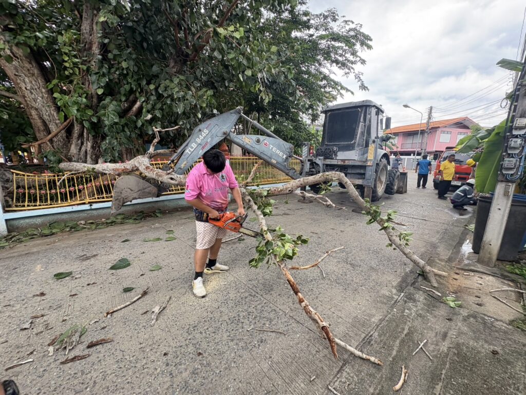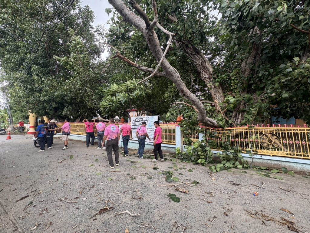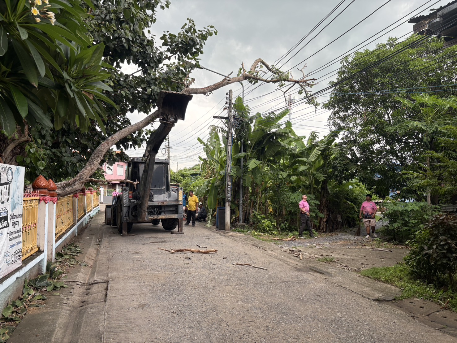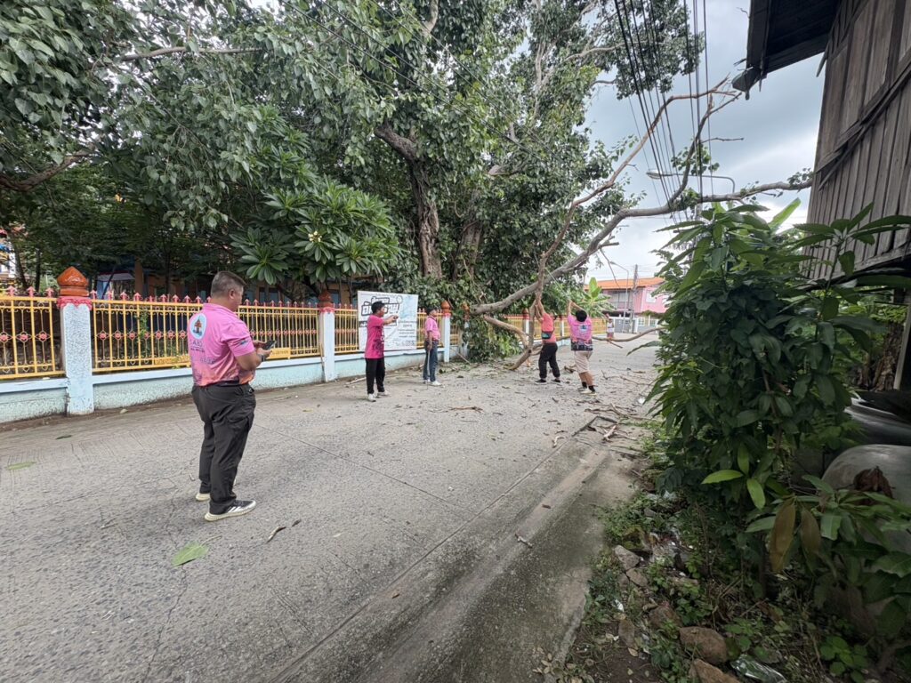 ลงพื้นที่ตัดรื้อถอนกิ่งต้นโพธิ์ที่หักทับบนถนน พร้อมประสานเจ้าหน้าที่การไฟฟ้าตัดต่อสายไฟฟ้าที่ให้แก่ประชาชน ในบ้านบริเวณด้านหลังวัดสว่างอารมณ์